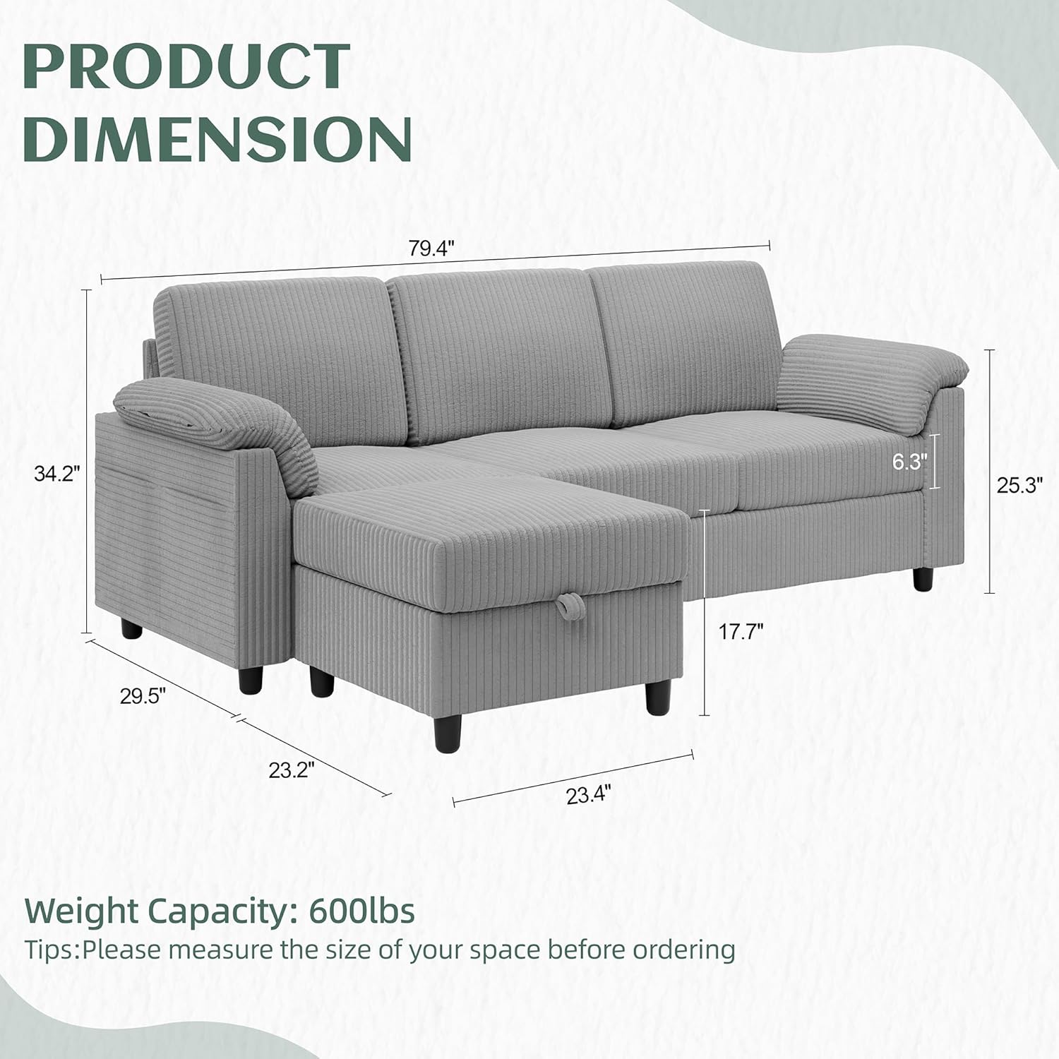 • Comfortable Sectional Sofa: The sofa is made of modern soft corduroy fabric with a hardwood frame as the basic structure. The linen fabric is comfortable and not easy to pilling, fading. Soft cushions and a reinforced back, eases the rebound, providing strong comfort.